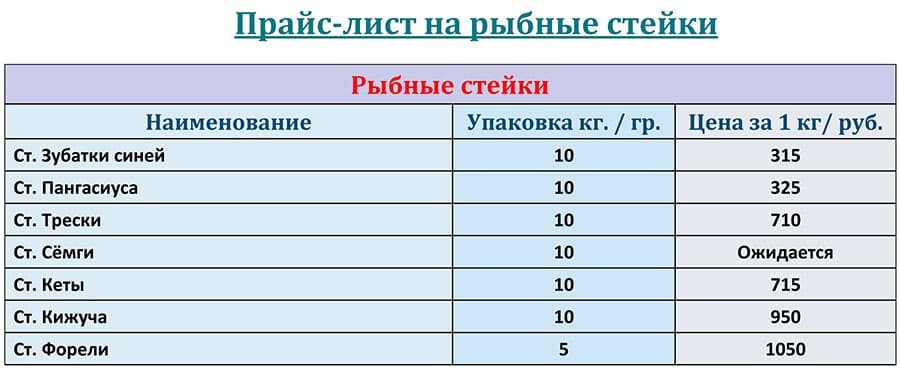 Прайс-лист рыбные стейки на АПРЕЛЬ 2026 года.